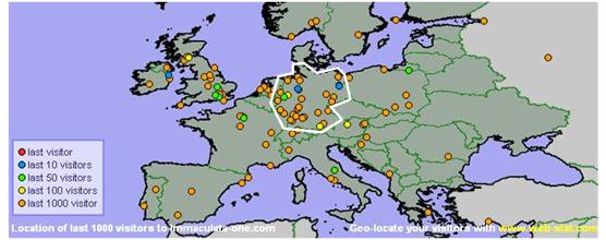 4. To illustrate the sending out of this standard message ... the below map shows website hits onto this site (map on Appendix D of this site) ... from Europe while I sent copies of the standard mailing (in German - on Section 175.1) to German websites ... sites that purport to be Catholic and German sites that are picking up on the vatican-2 cult apostasy. You can see the difference between German hits onto this site as opposed to France, Spain, Poland, etc. (which didn't get any e-mails). I couldn't demonstrate this effect using English since English is prevalent in large areas of the world.