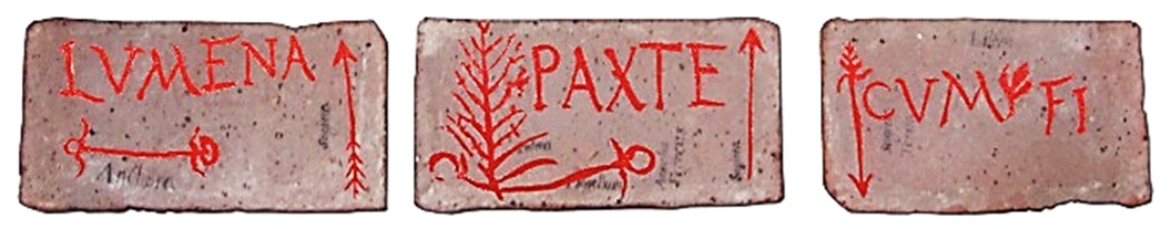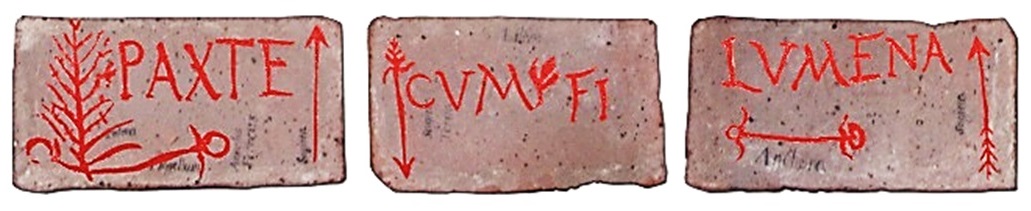4. On May 24, 1802 ... during cleaning and clearing work in the St. Priscilla catacombs ... a shelf-tomb that had never been opened was found with the three tiles and red inscriptions as seen here ... the tile symbols are explained in Sub-part A of this Section. The three tiles together are ... 5 feet, 9 inches long.