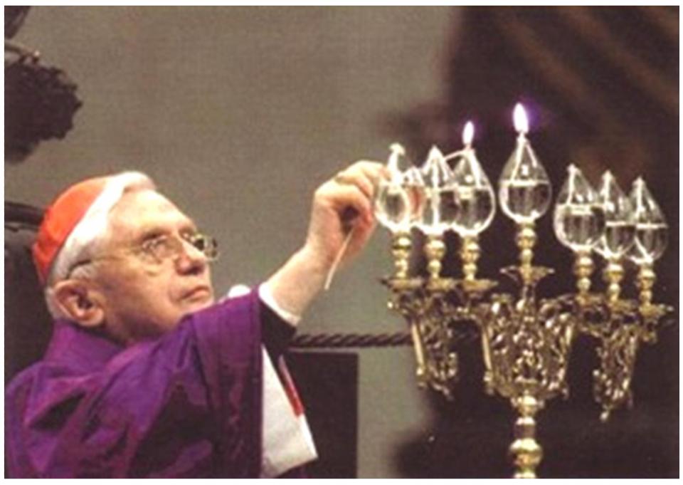 (2) Joseph Ratzinger (a.k.a. "Benedict XVI") - Lighting a menorah, working to send the un-baptized pagans who call themselves "jews" into Hell forever.